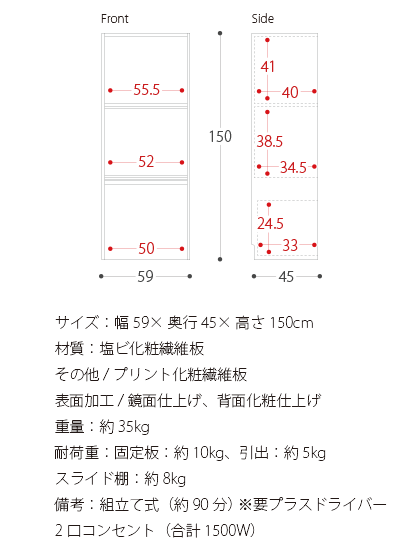 サイズ: 幅59×奥行45×高さ150cm 材質: 塩ビ化粧繊維板 その他/プリント化粧繊維板 表面加工/ 鏡面仕上げ、背面化粧仕上げ 重量:約35kg 耐荷重: 固定板:約10kg、引出:約5kg スライド棚:約8kg 備考: 組立て式(約90分) ※要プラスドライバー 2口コンセント(合計1500W)