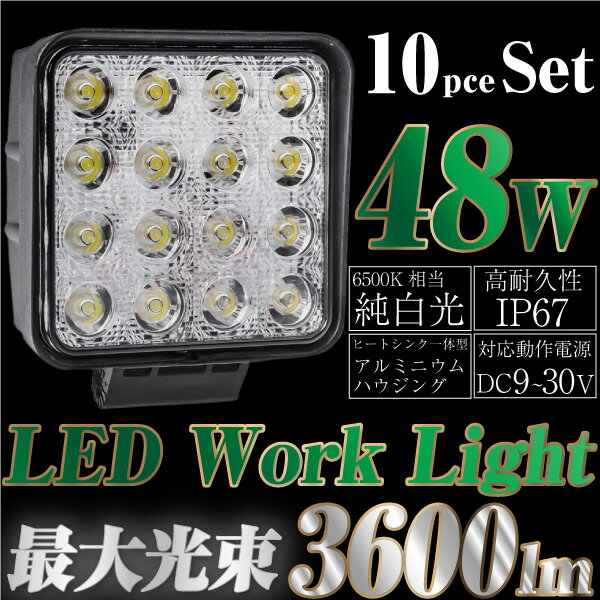 LED 投光器 ワークライト 作業灯 48W 角型 10個 スクエアタイプ 防水 防塵 12V 24V 集中 照射 3600lm 純白光 6500K 爆光 フォグランプ フォグライト 集魚灯 LEDライト 送料無料 _45302